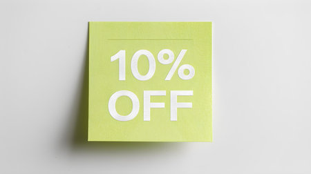 White '10% OFF' Text on a Light Green Square Paper Note. White background with copy space