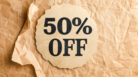 Black '50% OFF' Promotional Sign on a Light Brown Background with Copy Space