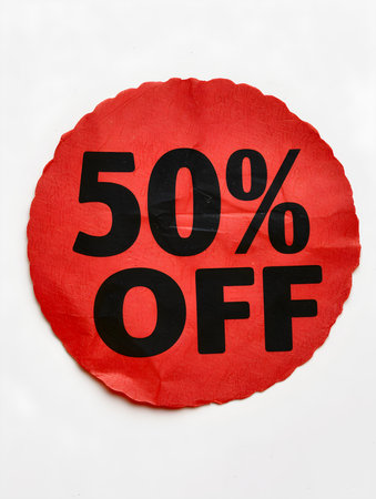 Black '50% OFF' Text on a Red Round Paper Note. White Background