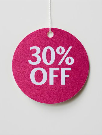 White '30% OFF' Text on a Magenta Round Paper Note. White Background