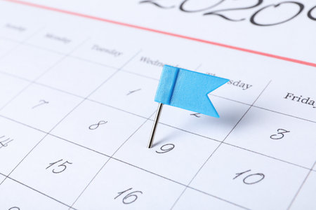 close up of calendar and pin on the green table background, planning for business meeting or travel planning concept