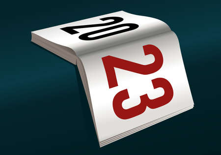 Greeting card with an open book on a white double page, which presents the year 2023.