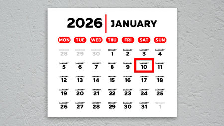 The date January 10th marked with a red cursor on the wall calendar 2026
