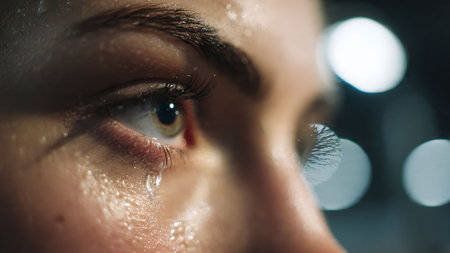Close-up of a woman's face with tears in her eyes, conveying sadness, pain, or intense emotion. Focus on eye.