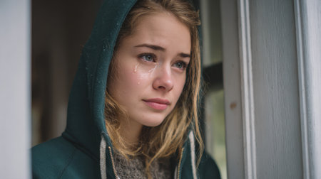 A young woman stands in a doorway with a sorrowful expression. Tear tracks are visible on her cheek as she gazes off into the distance, showing deep emotion.