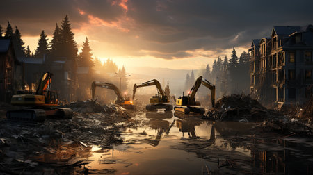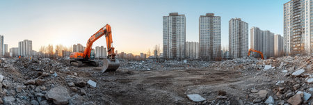 A busy construction site with heavy machinery works amidst concrete debris, representing urban transformation and demolition efforts in a formerly vacant area, signifying progress and change