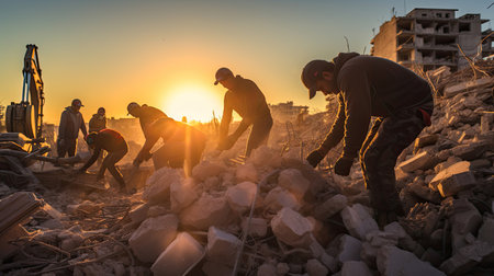 Rescue workers in hard hats and shovels searching through rubble and dust after an earthquake, illustrating the dangers and devastation of natural disasters