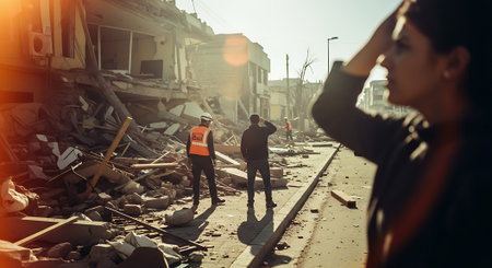 Rescue workers are searching for survivors in the rubble of a collapsed building after a devastating earthquake, highlighting the critical role of first responders in disaster relief efforts