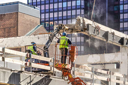 Rotterdam, The Netherlands, September 26, 2018: two construction workers with a pneumatic jackhammer at a demolition site for the Forum building on Lijnbaan