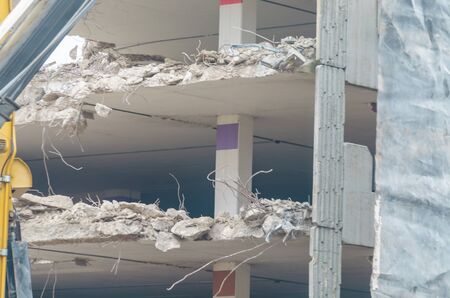 Professional demolition of reinforced concrete structures using industrial hydraulic hammer. Rods of metal fittings. Wreckage and crumbles of concrete.