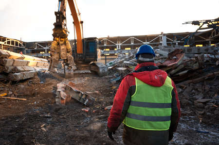 Demolition of abandoned industrial building by excavator