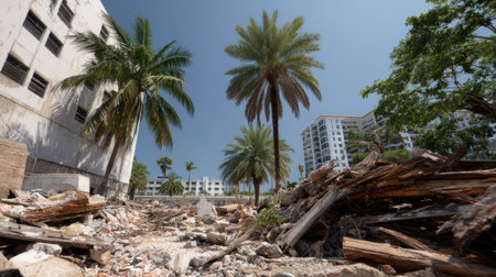 This image captures a scene of urban decay featuring palm trees amid the rubble of demolished buildings, showcasing nature