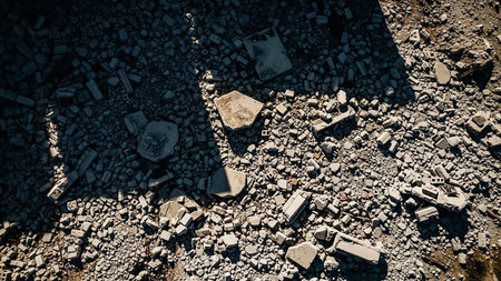 Industrial showing overhead drone view of a chaotic pile of rubble and debris from a demolished building, with sharp shadows keywords: rubble, debris, demolition,...