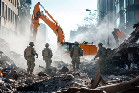 Soldiers working on a rescue mission, clearing debris from a collapsed building after a devastating earthquake