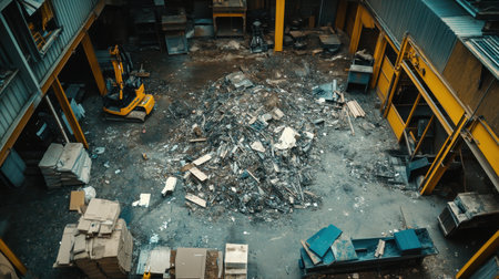 Aerial view of a cluttered industrial warehouse showcasing a large pile of debris, highlighting the ongoing activities in construction and waste management sectors.