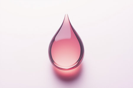 A delicate pink droplet sits gracefully on a clean surface, reflecting soft light, showing its translucent beauty.