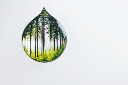 A water droplet reflects a pine forest, symbolizing natures purity and serenity against a clear white backdrop.