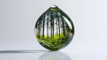 A clear water droplet showcases a vibrant pine forest within, emphasizing the beauty of nature and purity against a white backdrop, symbolizing serenity.