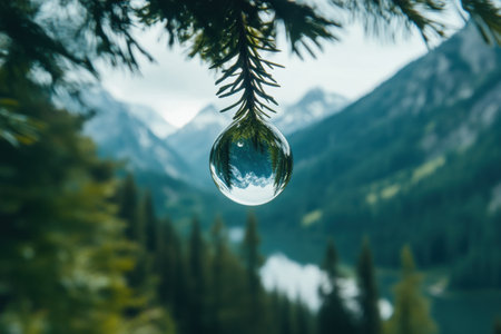 Captivating droplet hangs delicately from a branch, reflecting a breathtaking mountain range and tranquil forest scenery in the distance as nature unfolds.