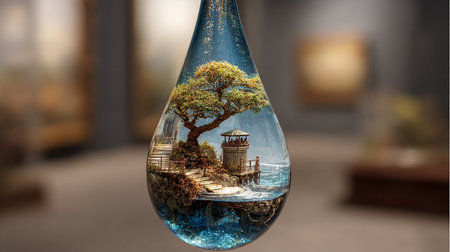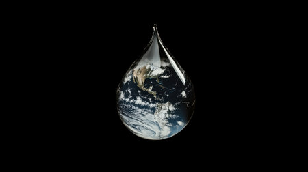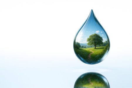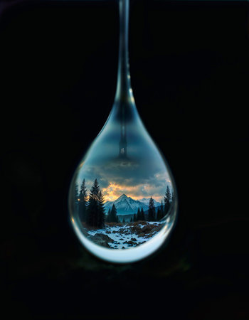 This breathtaking image showcases a water droplet reflecting Earth's stunning landscapes, symbolizing the delicate balance of nature and the importance of environmental awareness.