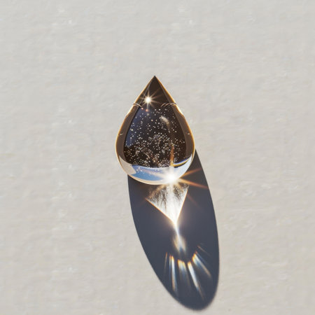 A close-up view of a sparkling water drop featuring bright reflections and glittery particles, set on a light surface. Ideal for nature and beauty concepts.