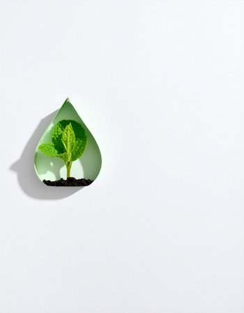 A tiny green sprout flourishes within the protective embrace of a crystal-clear water drop.