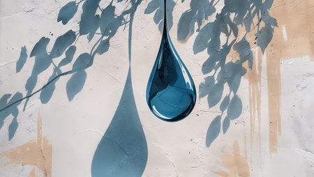 Big blue drop hanging and reflecting the shadow of a plant on a textured wall. Ai generated image