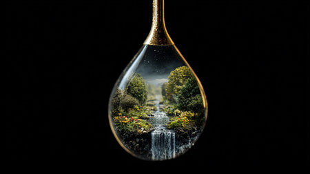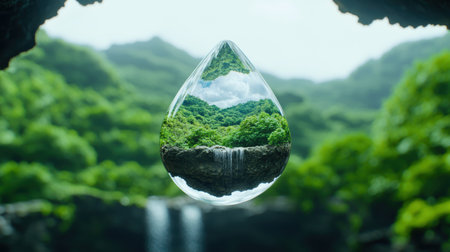A single, perfect droplet holds the entire essence of a vibrant forest, symbolizing the precious and fragile nature of our planets ecosystems. This image represents a call for conservation, purity, and a sustainable future.