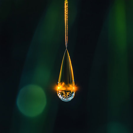 A Single, Reflective Water Droplet Hangs, Illuminated by Warm, Out-of-Focus Bokeh Lights