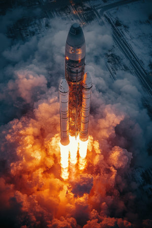 A powerful rocket lifts off from the launch pad, surrounded by billowing smoke and flames, marking the start of an incredible journey into space.