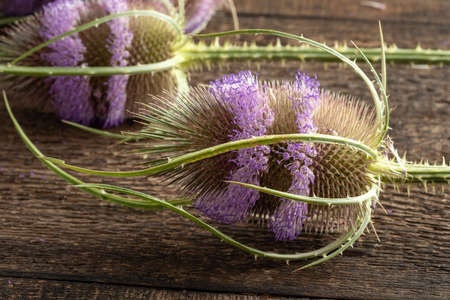 Close up of wild teasel flowers on a wooden table