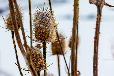 Dry thistle in the winter on the field. Spiny thistle