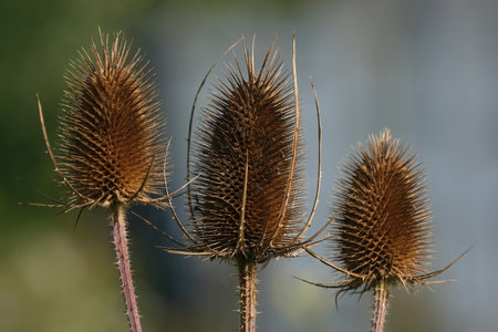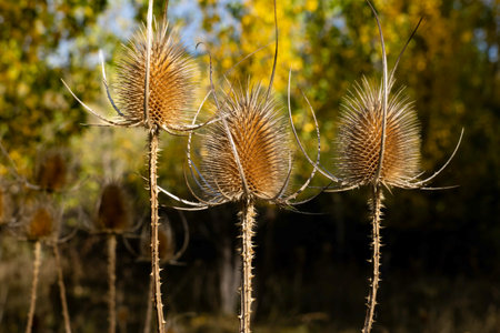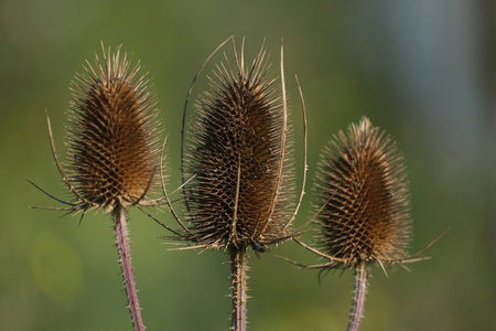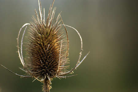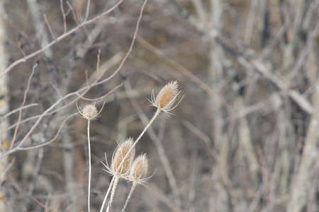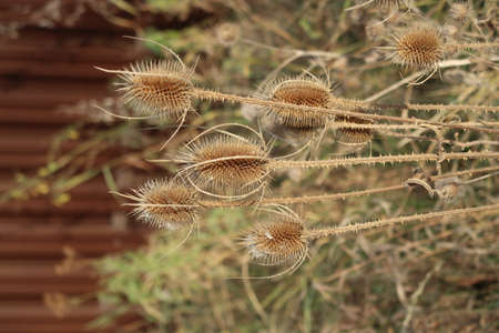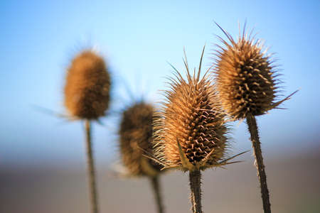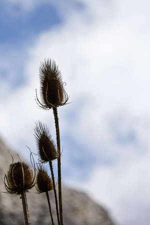 Wild teasel in nature, early spring. Brown nature photography, close up of dry plants. Spiky dry plant in natural environment.