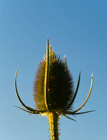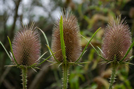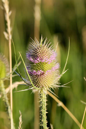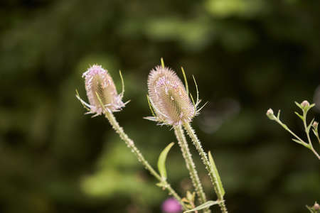 Close up of Teasel in bloom in summer, nature. thistle prickly, weed plant.