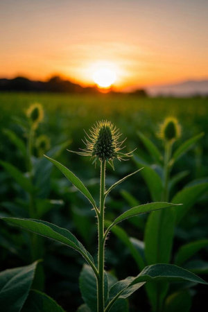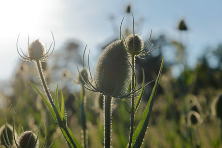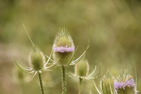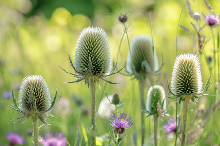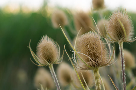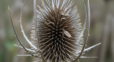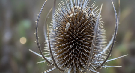 Wild teasel (dipsacus fullonum) in close up on a late summer field. natural macro photography. Generative AI