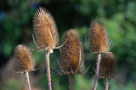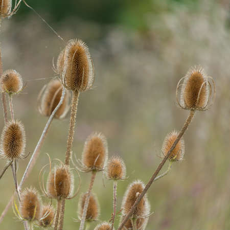 Close up of dried seed heads of Dipsacus fullonum, commonly known as wild teasel or common teasel on meadow