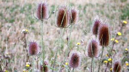 Carding thistles, dipsacus fullonum, in the field in late summer