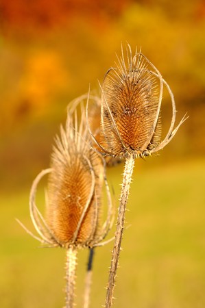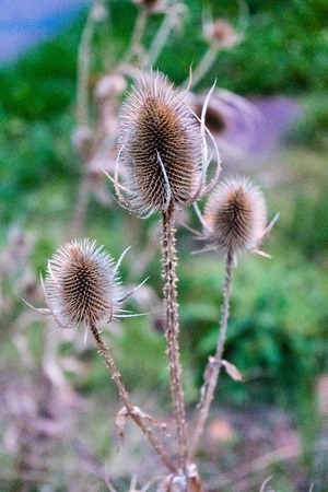 Close-up of brown cutleaf teasel seeds with other blurred plants on background