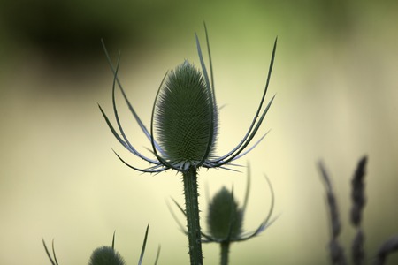 Green cutleaf teasel seeds close-up view with warm green blurred background