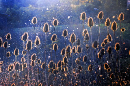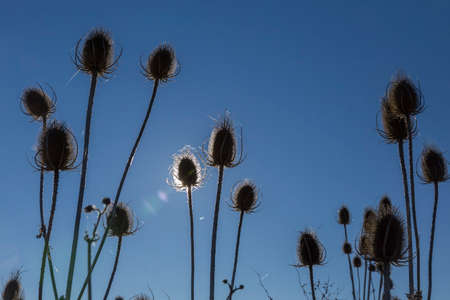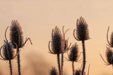 Frost covered dipsacus plants (Wild teasel) back list by warm early morning winter sun