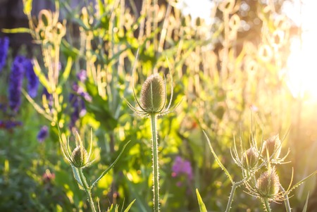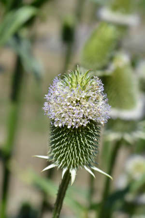 Dipsacus fullonum, wild gourd flowers in garden macro selective focus. private plant.