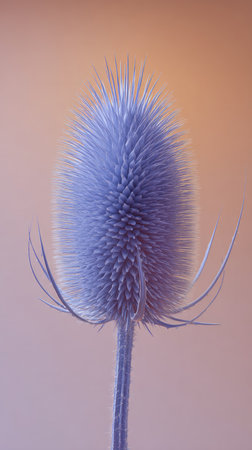 A detailed image of a blue teasel flower, showcasing its intricate structure and texture, set against a blurred backdrop.