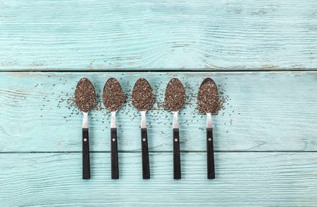 Set of tea on the vintage silverware spoons, various of tea, black, flower, green and mint tea