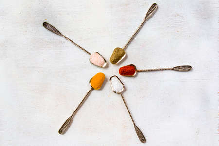 variation of spices on the vintage silver spoons, all spices on the table, colorful food background