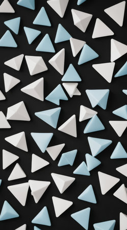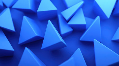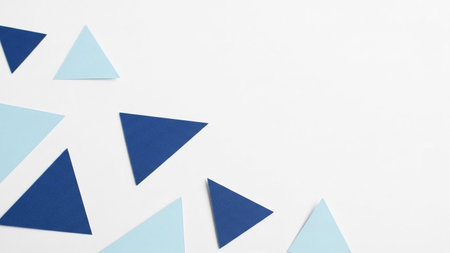 A minimalist composition featuring an arrangement of navy blue and light blue paper triangles scattered across a stark white background. The geometric shapes are crisp and distinct, creating a clean and modern visual. The arrangement offers a sense of playful yet ordered asymmetry, with the contrasting shades of blue providing subtle depth.