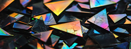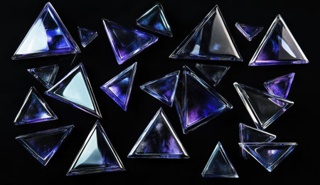 A black background with dark blue and purple triangles in the foreground, with geometric shapes made of glass or plastic floating above it. The triangles have sharp edges and are arranged to form an abstract pattern that suggests movement and depth. There is space between each triangle for text. --ar 26:15 --v 6.1 Job ID: f73d476e-d7be-487f-a118-94a07b3122b2