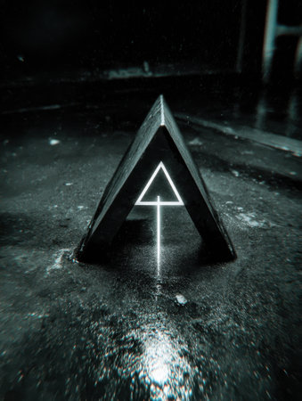 An abstract triangle structure with a glowing symbol stands on a shiny, dark surface in a dimly lit industrial space, evoking a mysterious atmosphere.
