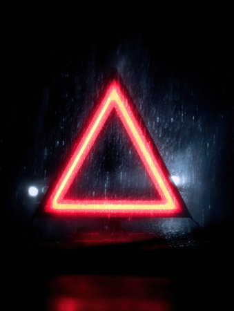 A bright emergency alert notification glows in the dark, signaling a moment for important decisions on an unlit road under rain.