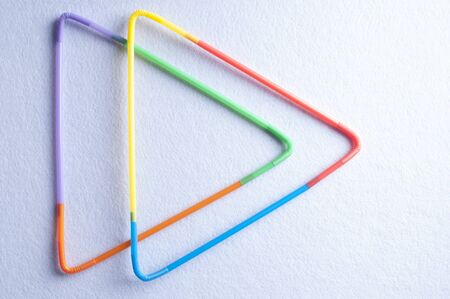 Nested wooden triangles painted in rainbow colors. Flat lay on white paper background.