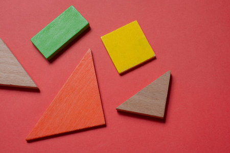 Concept of creative logical thinking. Different colorful wooden blocks. Geometric shapes in different colors.